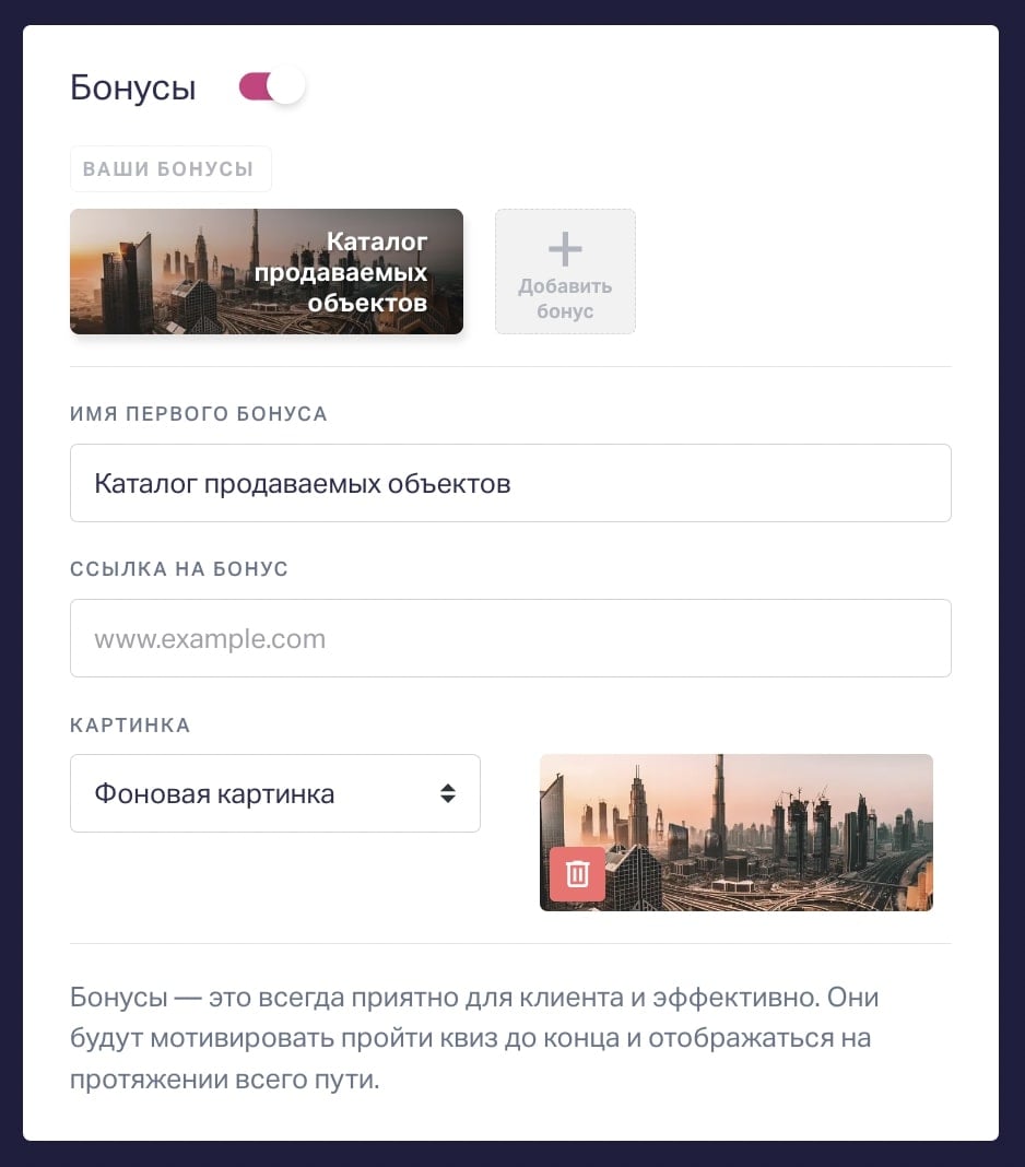 ✅ Бонусы после прохождения. Кроме скидок, можно добавлять лидмагниты в квиз — когда пользователь получает что-то конкретное прямо сейчас: каталог, презентацию, чек-лист и так далее.