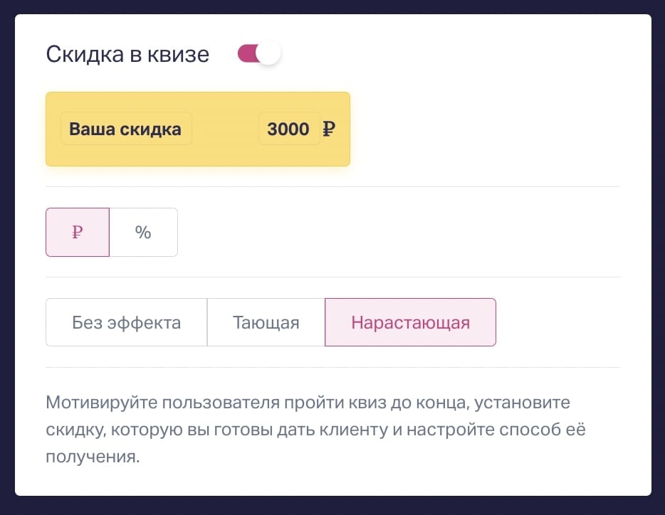 ✅ Скидка в квизе — в рублях или процентах, нарастающая или тающая будет сопровождать пользователя на протяжении всего квиза