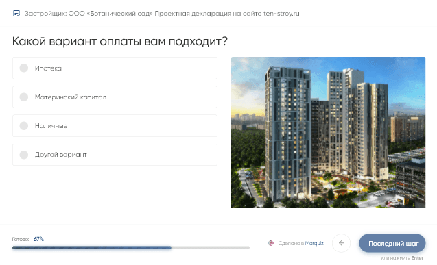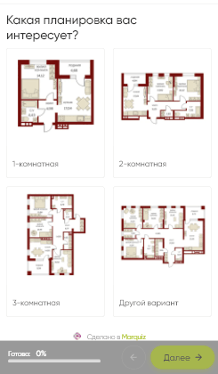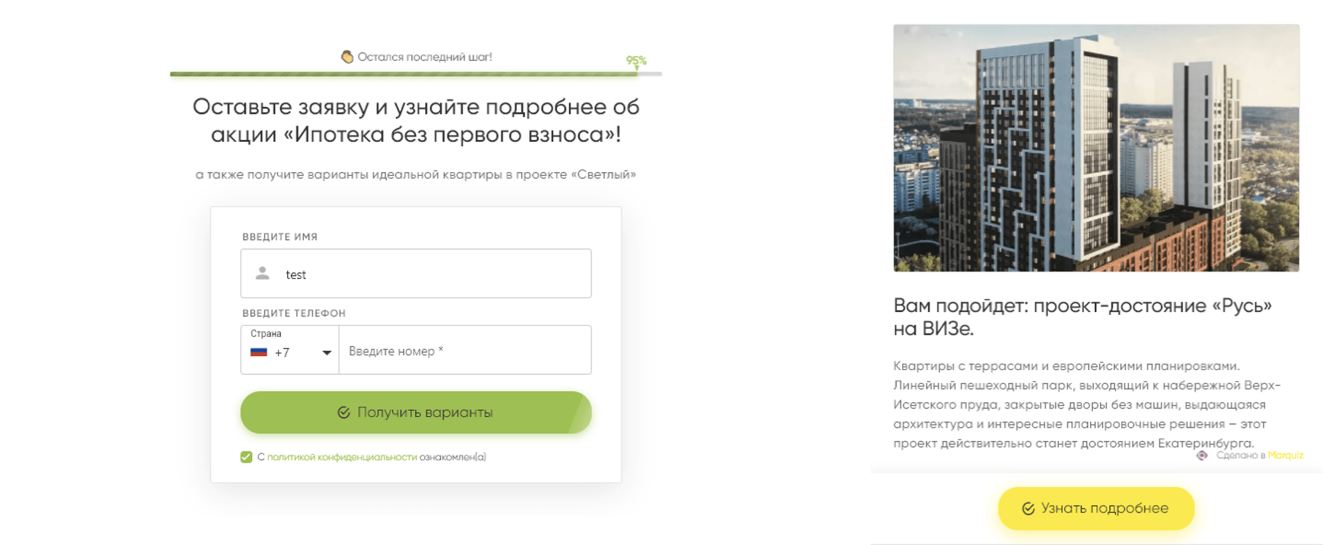 На последнем шаге потенциальному клиенту предлагали получить варианты жилого комплекса или квартиры в соответствии с выбранными критериями.