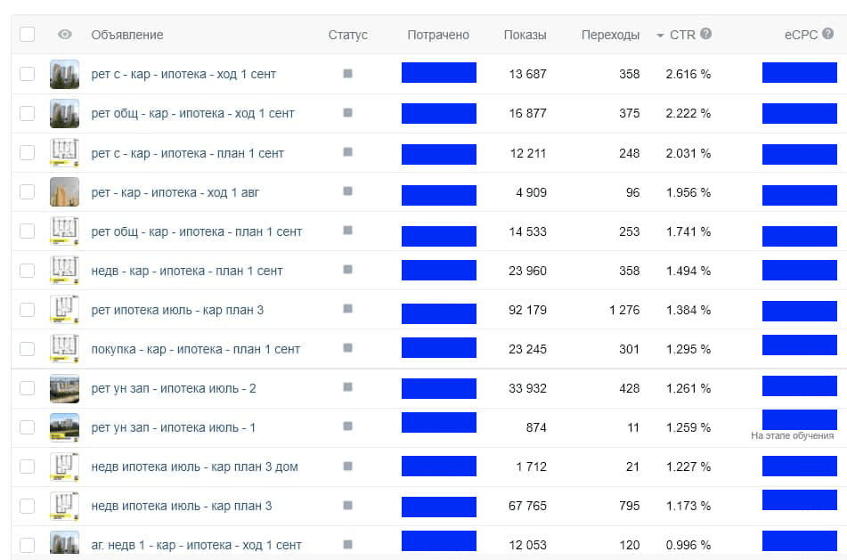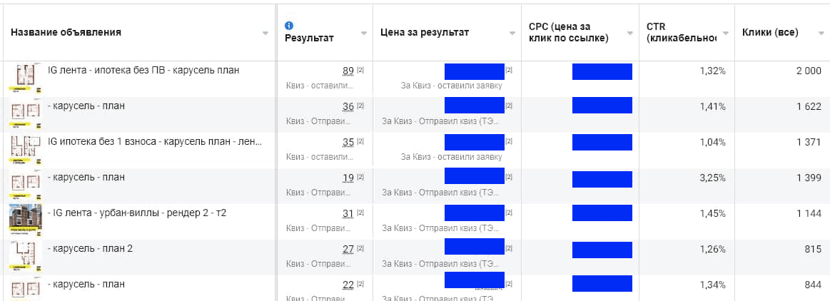 Самый высокий ctr на креативах с планировками и ходом строительства (на всех площадках).