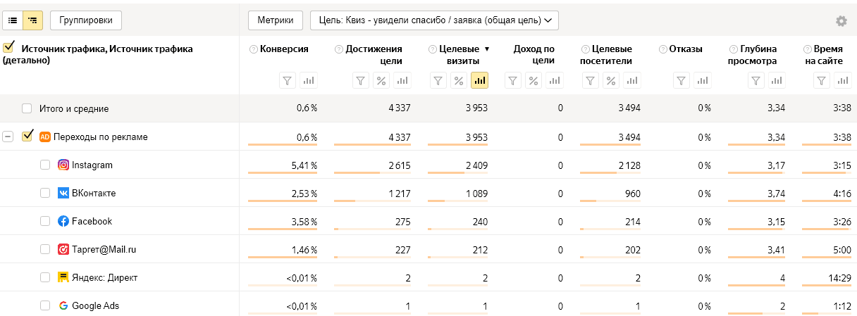 Статистика из Яндекс. Метрики по общему квизу TEN.
