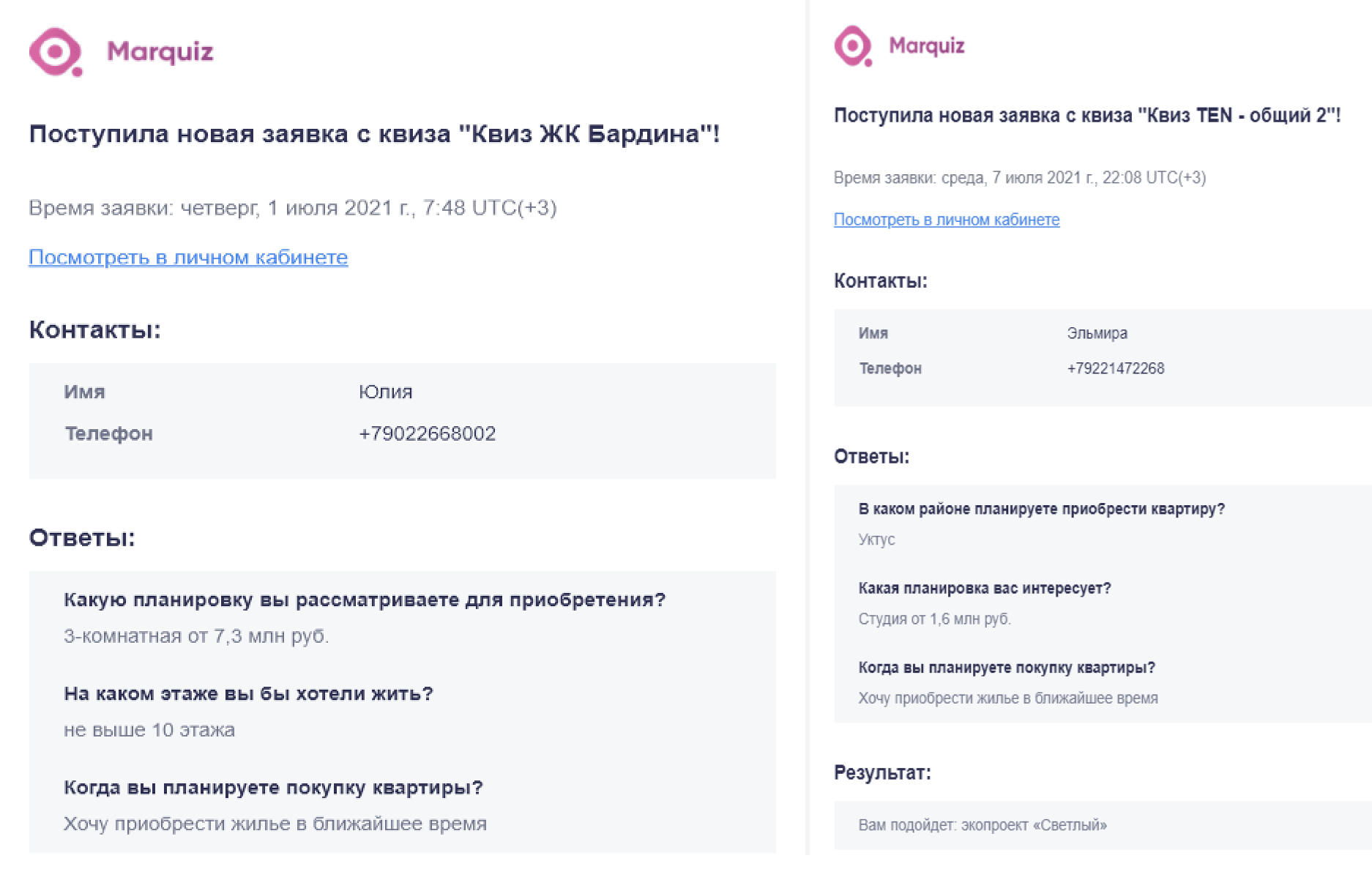 Настроена интеграция с crm-системой клиента. Заявки приходят в удобном виде, где видно все ответы клиента, а также варианты подбора жк или квартиры.