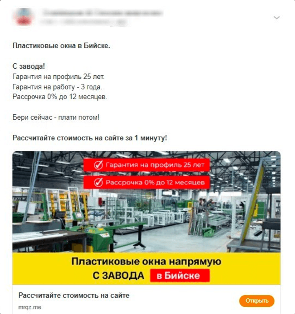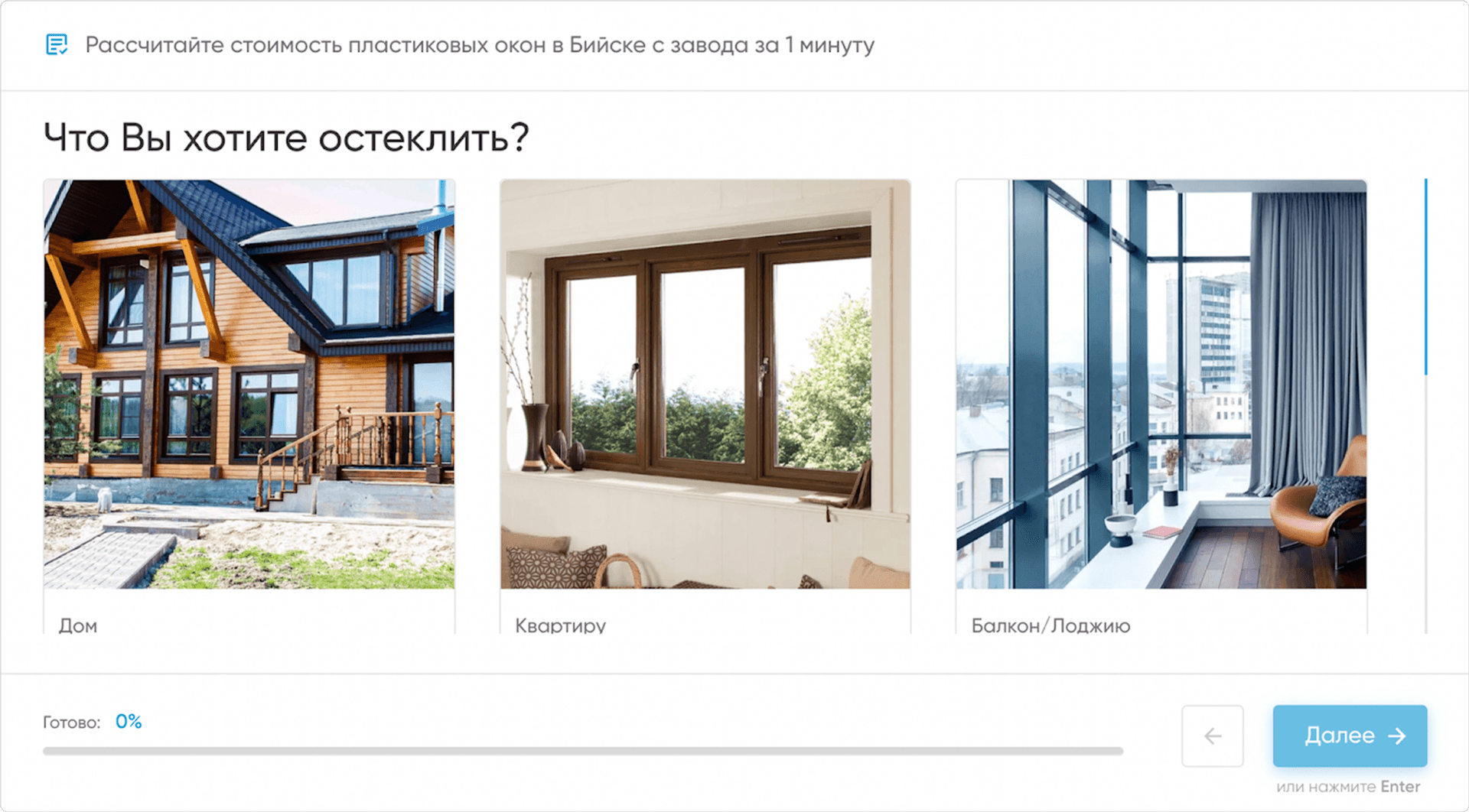➡️ Самая рабочая посадочная страница — квиз с оффером «Пластиковые окна под ключ напрямую с завода» и кнопка «Рассчитайте стоимость».