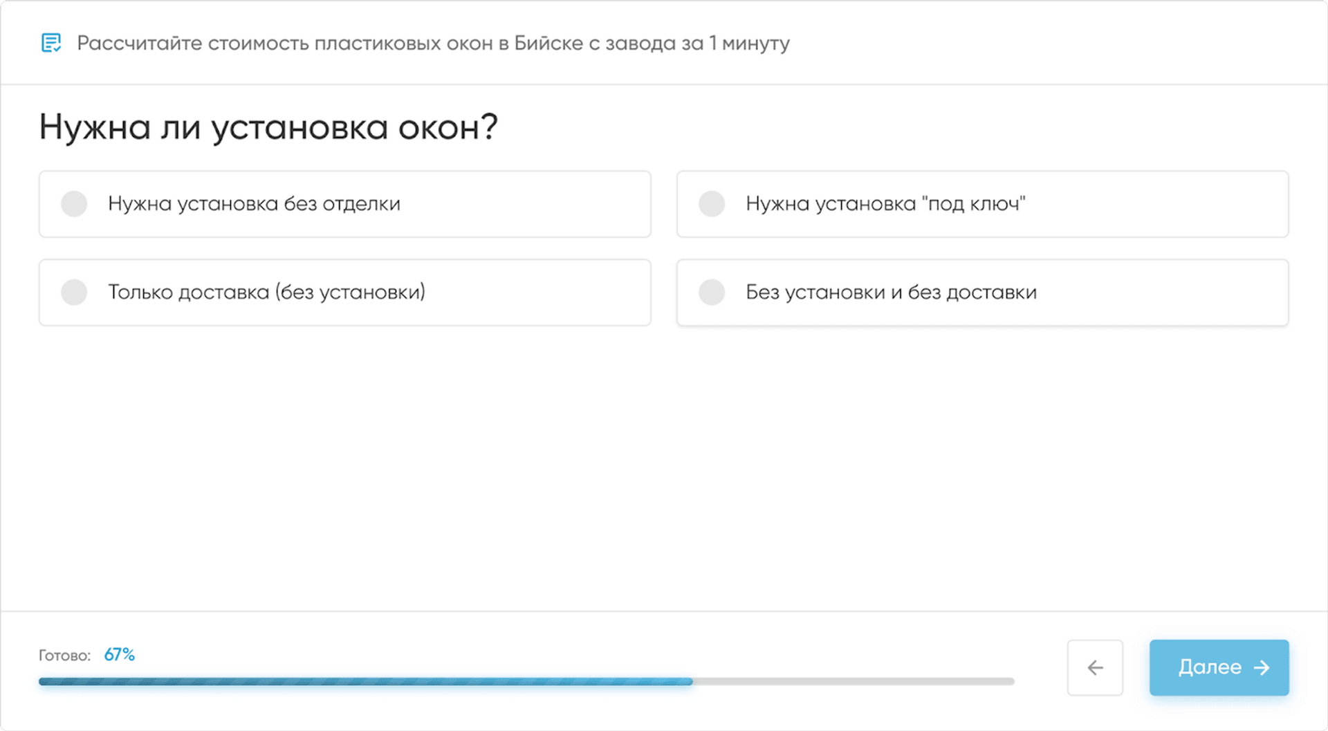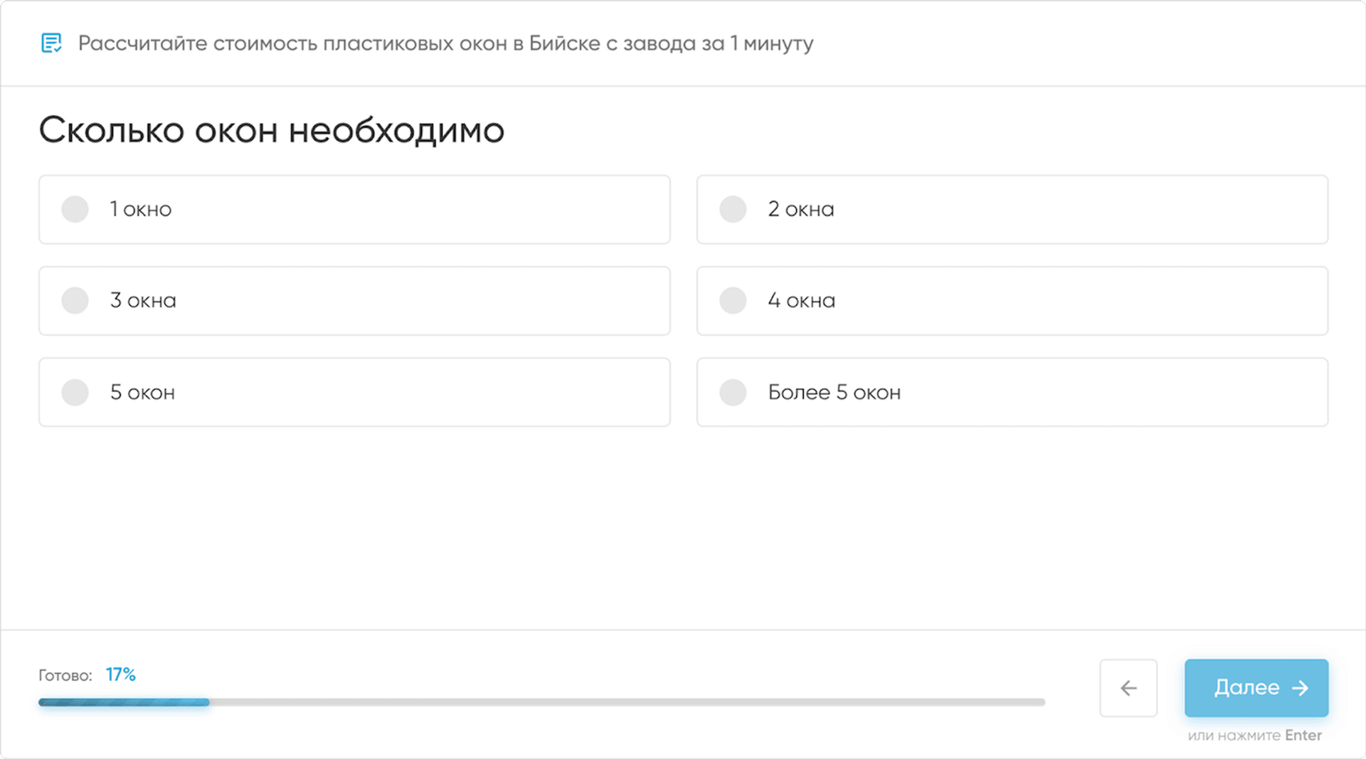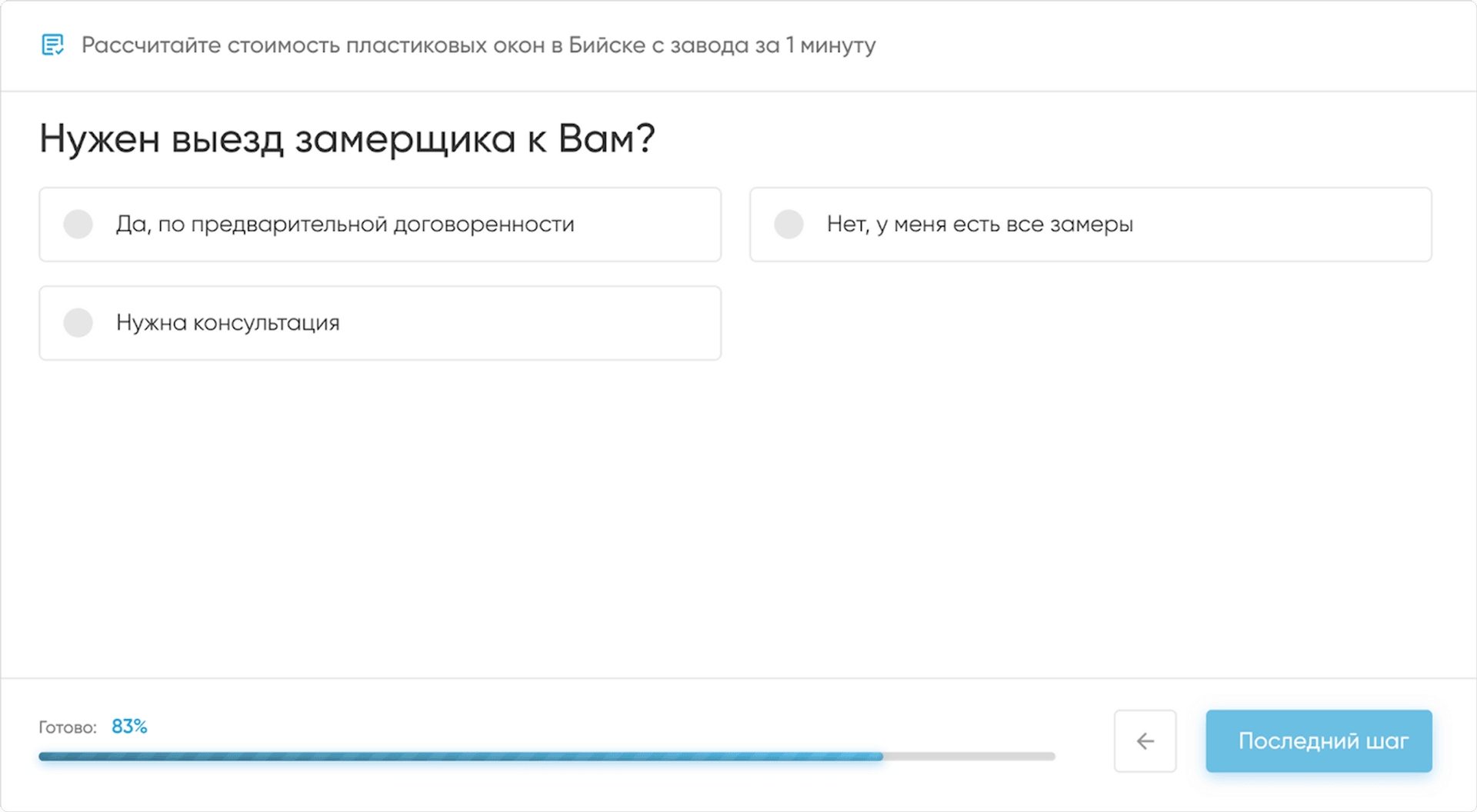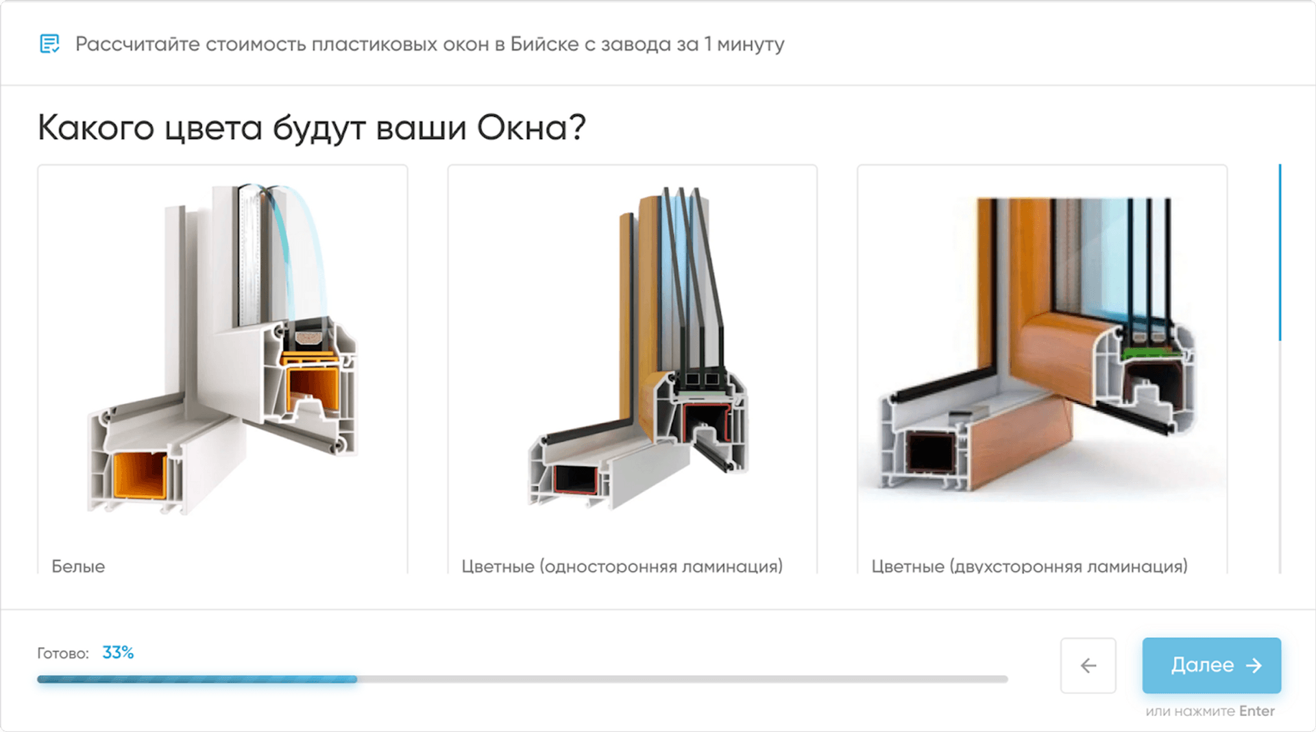 Составили 6 вопросов, из специфических — когда спрашивали про профили и компоновку, показывали картинкой пример, чтобы клиент-неспециалист мог выбрать то, что ему подходит.