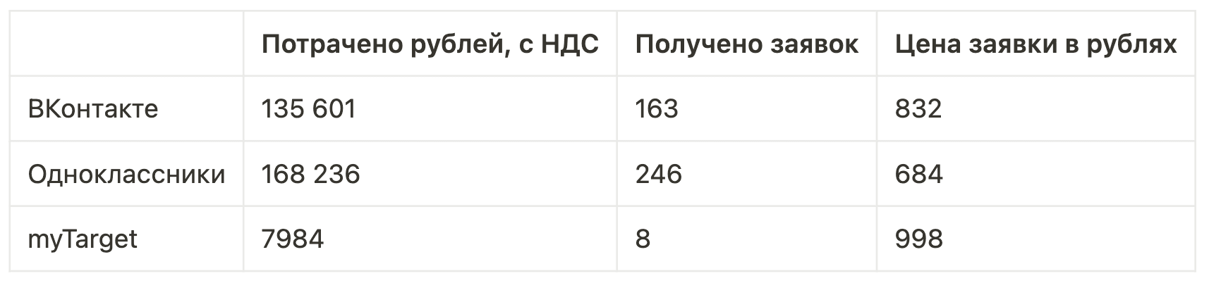 Реклама в Одноклассниках показала наиболее интересные результаты, myTarget отработал слабее всех. Вместе с клиентом мы сформулировали новые гипотезы и перенаправили основной бюджет на ВКонтакте и Одноклассников.