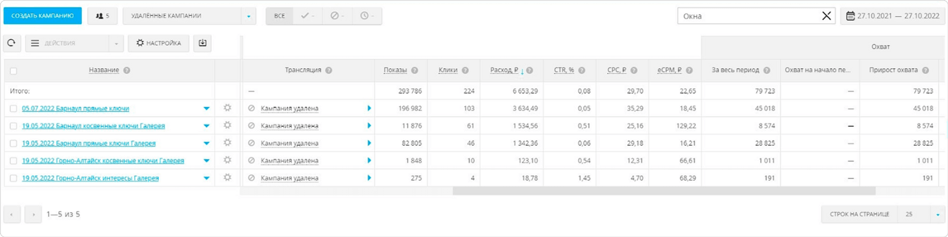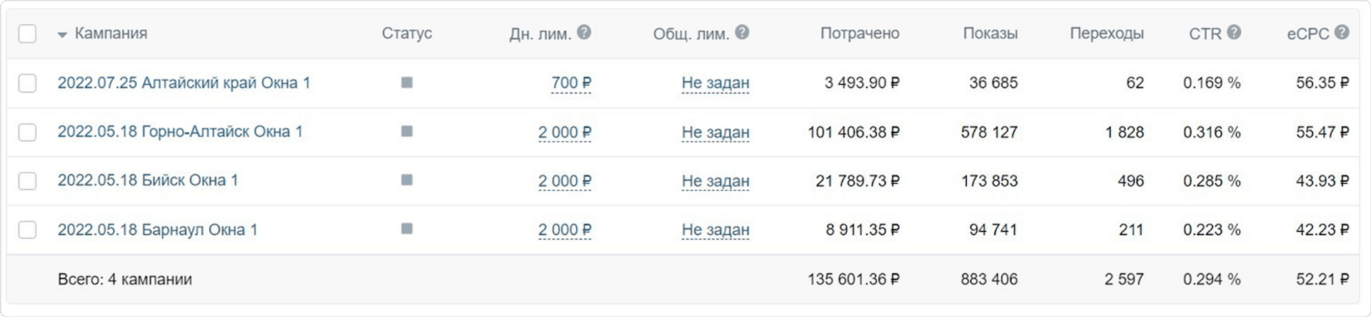 myTarget в этой кампании не оправдал ожидания. Мы постепенно сокращали бюджет на канал и перенаправляли на ОК и ВК. Скриншот из рекламного кабинета myTarget: