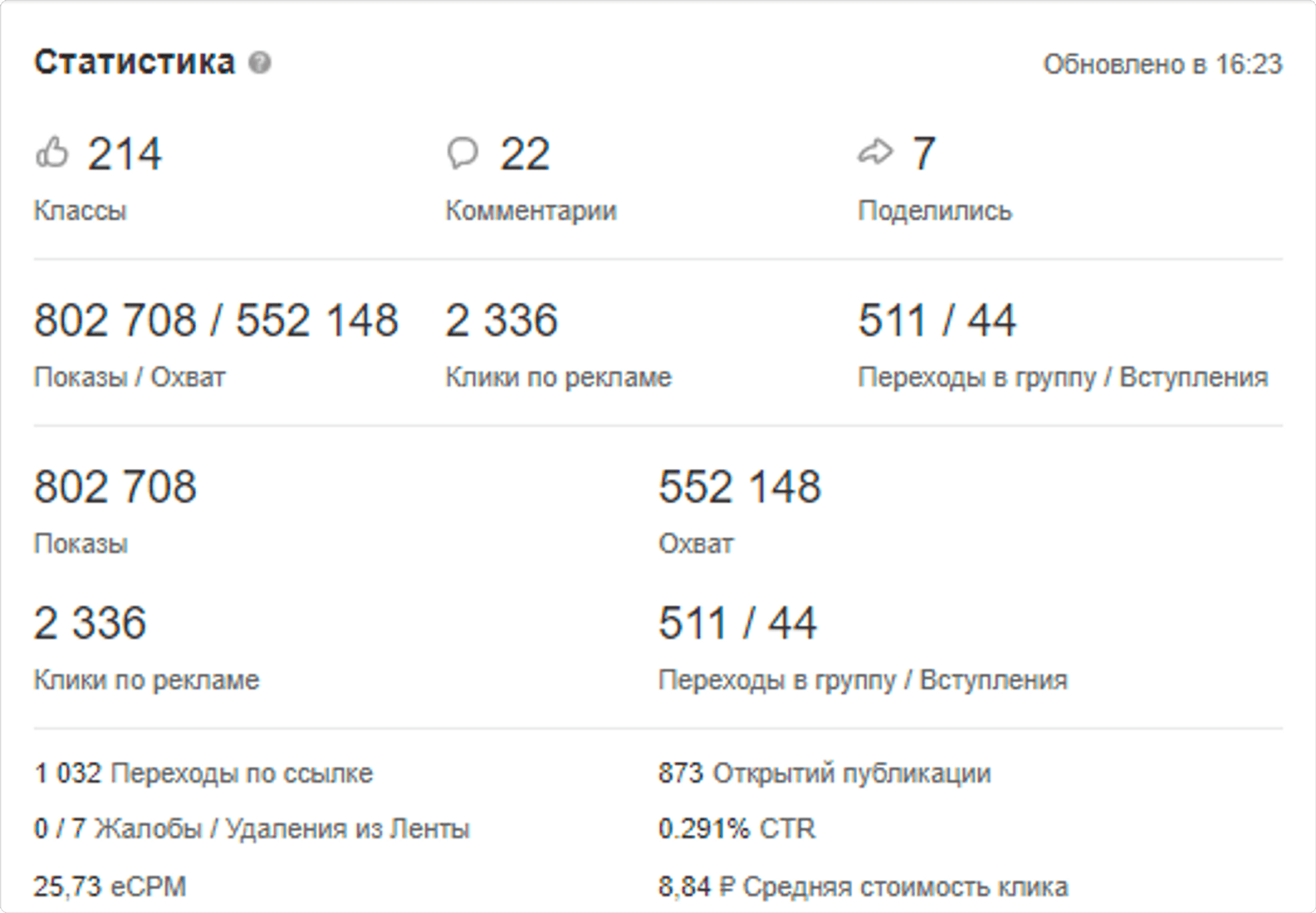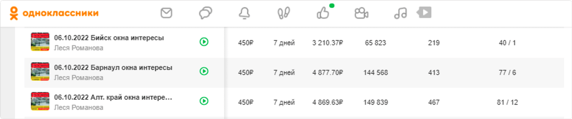 В Одноклассниках аудитория вовлекалась выше, чем ВКонтакте. В ОК мы помимо трафика на квиз получали лайки, комментарии, репосты рекламных публикаций. Это дало дополнительный охват и количество заявок.