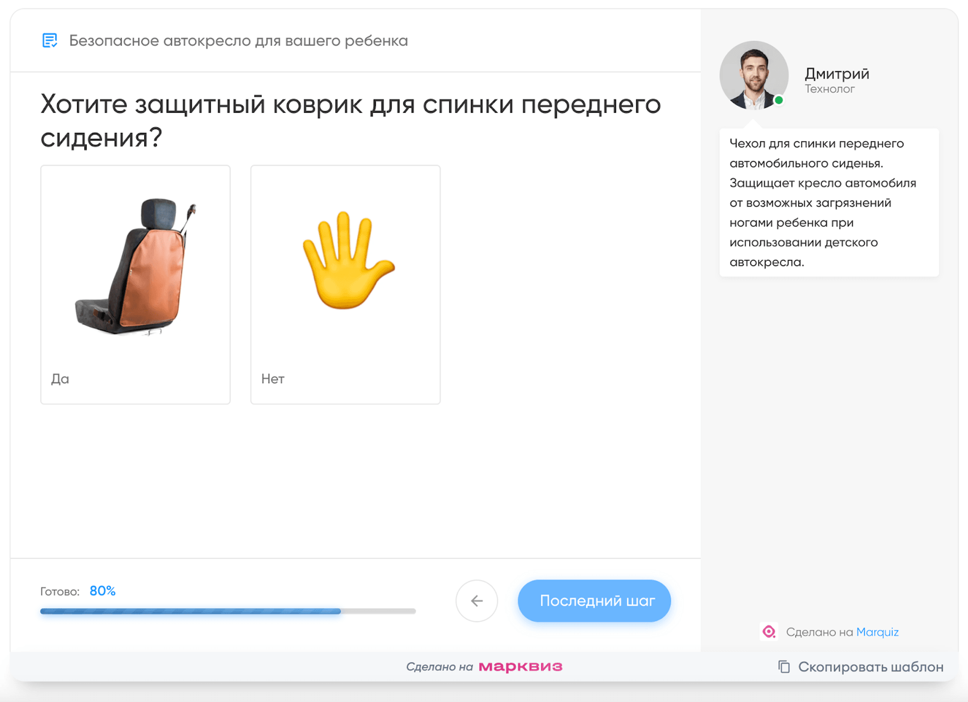 Например, ещё с квизом не менее удобно кросс-сейлить, как в шаблоне квиза по выбору детского автокресла:
