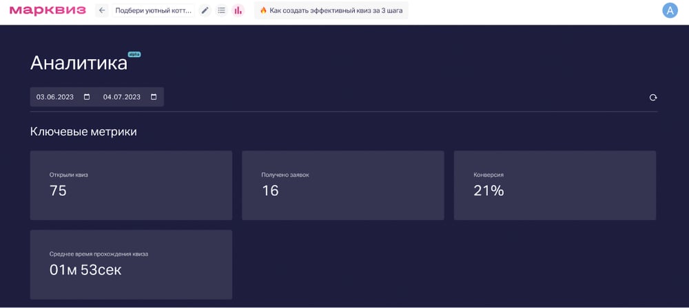 Смотрим статистику в панели Марквиз. На карточке квиза видно, сколько человек открыли квиз, сколько дошли до формы контактов. CR в заявку считается автоматически.