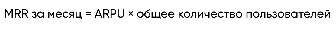 MRR (Monthly Recurring Revenue) — это средний месячный доход компании. Самый простой способ получить данные метрики MRR — взять средний доход на пользователя (ARPU) за месяц, а затем умножить его на общее количество пользователей в данном месяце. Отказ от нашего продукта Churn Rate снижает доход MRR.