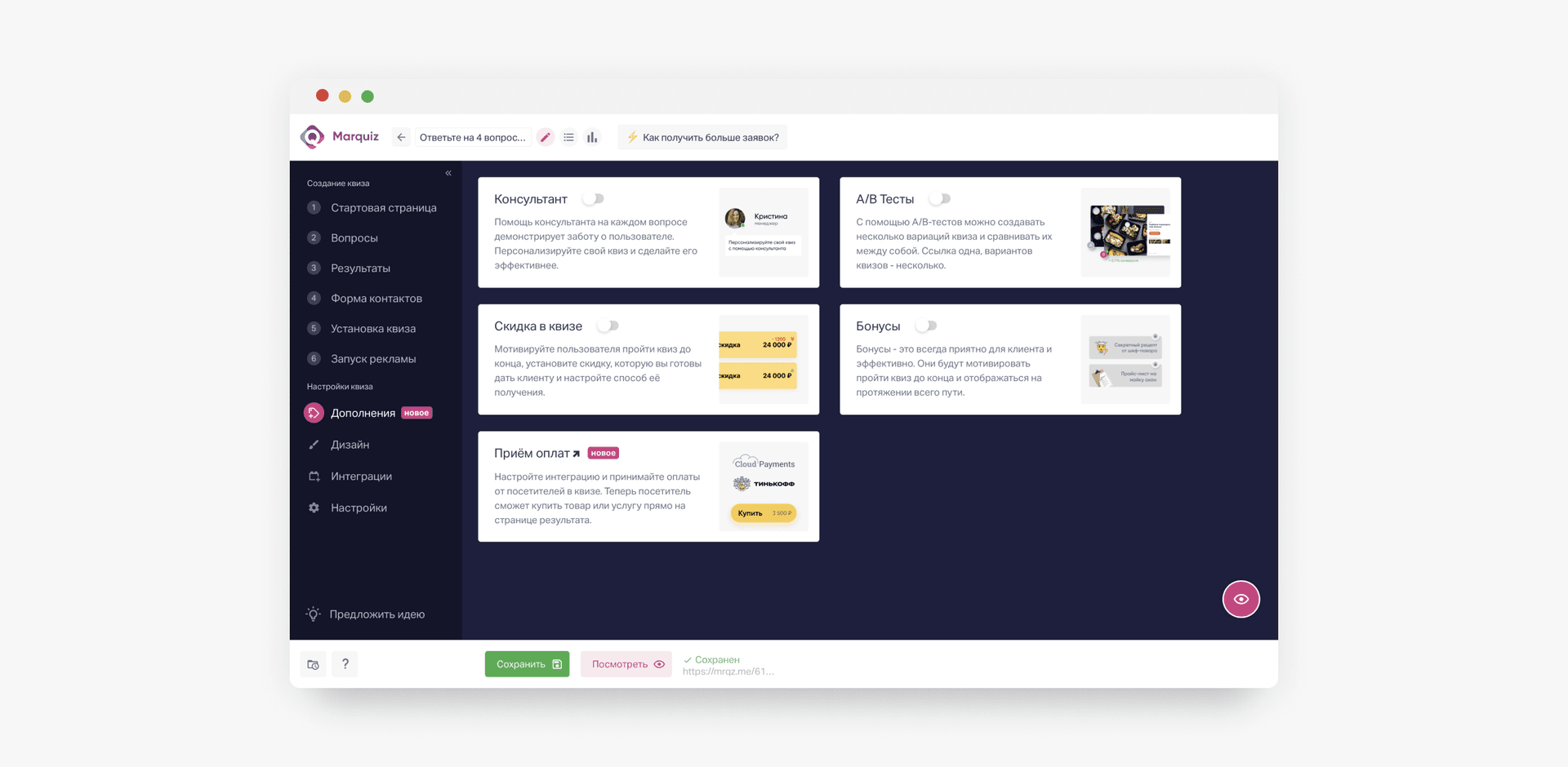 Отправили консультанта и настройку A/B тестов во вкладку “Дополнения”. Теперь важные опции к квизу собраны в одном месте. Не теряйте 😉