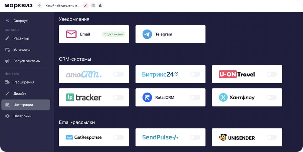 Например, в Марквизе можно подключить 400+ полезных интеграций к форме сбора контактов