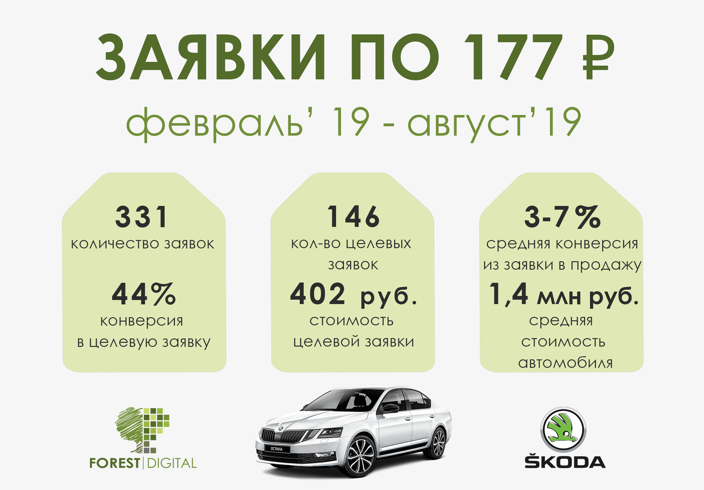 Новую рекламную кампанию запустили уже только на две аудитории: с интересом ŠKODA и Volkswagen. Цель поставили - конверсия. В креативах мы сделали упор только на сторис, так как именно этот формат приносил лучшие результаты в прошлом запуске. В итоге за два месяца работы (май - июнь 2019 г.) мы привлекли 103 заявки на покупку нового автомобиля ŠKODA Octavia по цене в 130 рублей. То есть, после перехода на КВИЗ-опросник нам удалось еще снизить стоимость заявки в 2 раза.