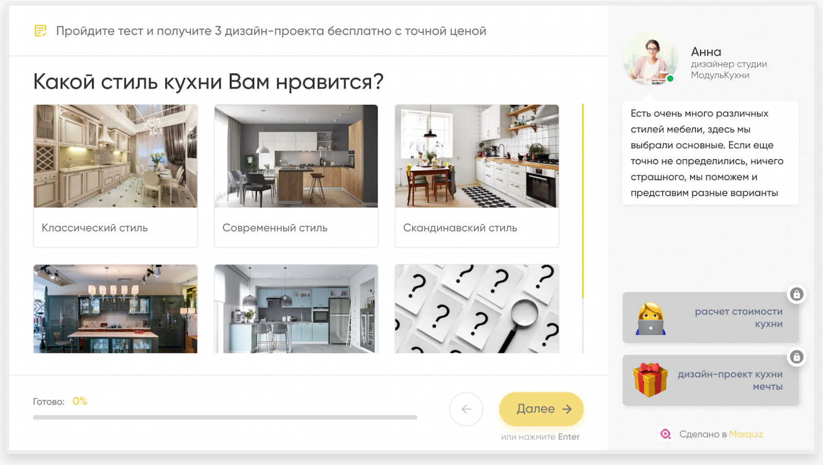 Посмотрим наиболее удачные примеры по четырем категориям: товар, услуга, опрос, инфобизнес. Идеала не существует, потому что даже самый проработанный квиз всегда можно улучшить.