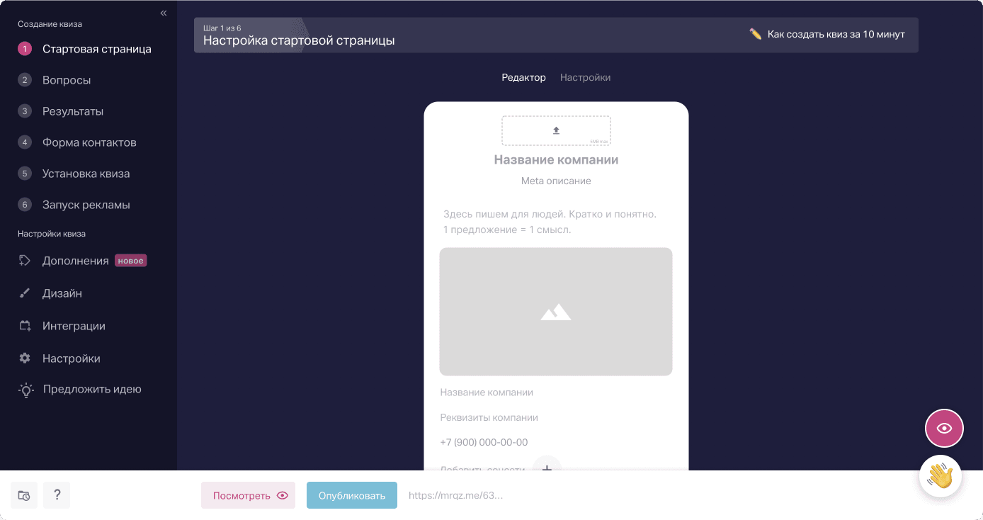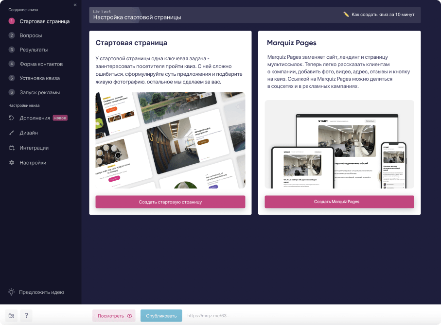 Раньше, было так: стартовая страница квиза служила одновременно посадочной страницей. Например, сделали квиз на своём домене или оставили на домене Marquiz, и ссылкой на квиз поделились в профиле соцсетей или в рекламных материалах, чтобы клиент попадал сразу на квиз-лендинг.