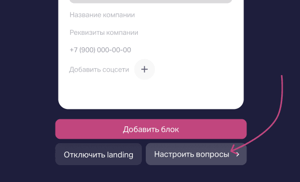 - Когда собрали Marquiz Pages, переходим по кнопке «Настроить вопросы» и вот мы уже создаём, как обычно квиз. Финально квиз будет на лендинге кнопкой или по скролу.