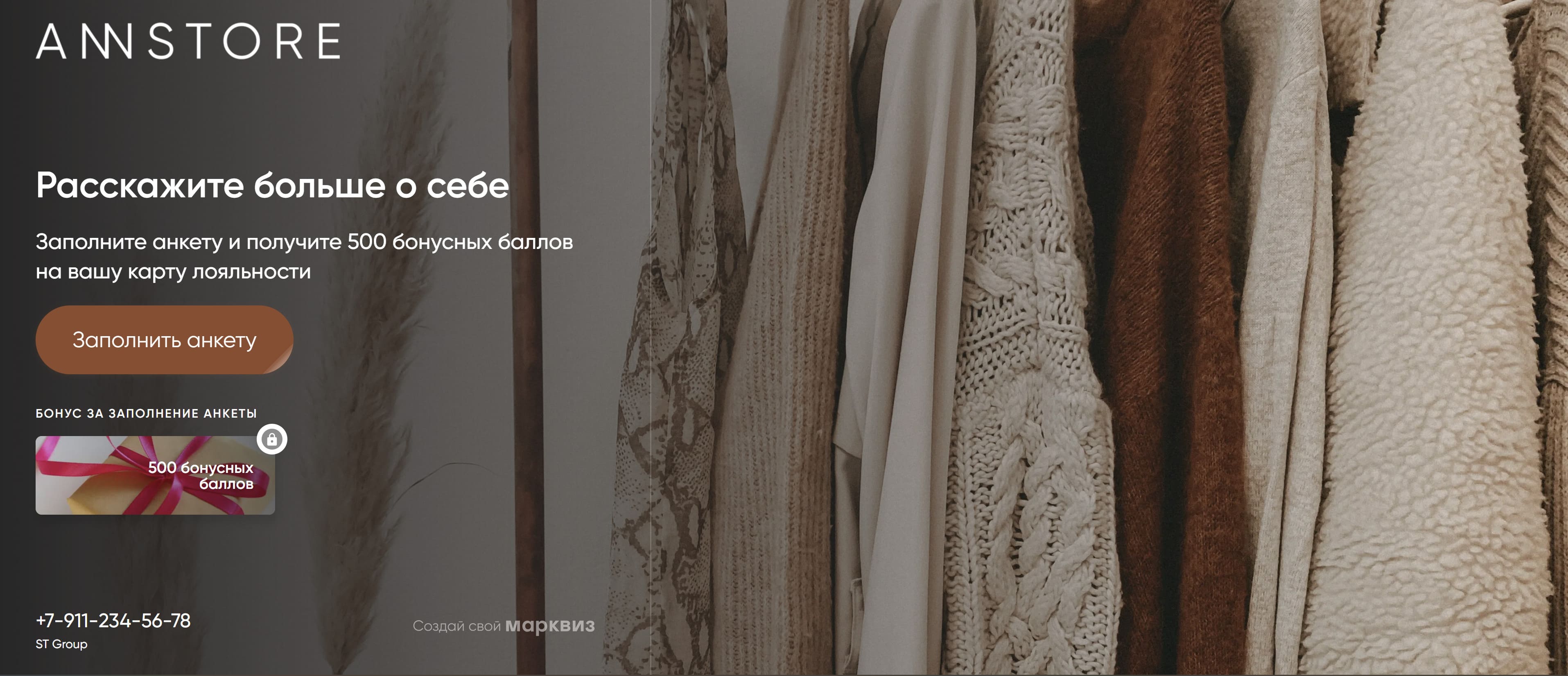 Шаг 2. Собрать данные. Получить их можно только из опросов. Чтобы упростить себе работу, собираем тест-опрос с основными вопросами на конструкторе Марквиз. В качестве награды за прохождение теста мы предложили скидку 10% на весь ассортимент товаров бренда.