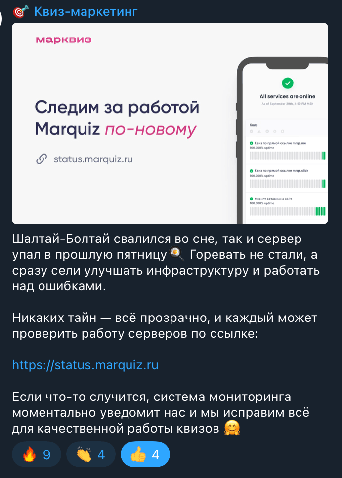 Квизы — это простой инструмент, который будет понятен как профессиональному маркетологу, так и просто предпринимателю, который хочет делать всё сам. Поэтому мы боремся со сложными терминами, объясняем простым языком понятия из мира квизов и маркетинга. Не зарастаем профдеформацией, пишем проще.